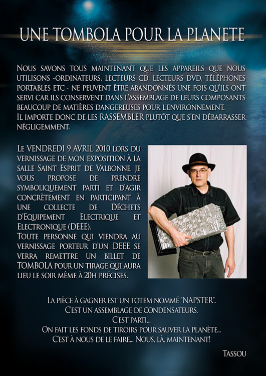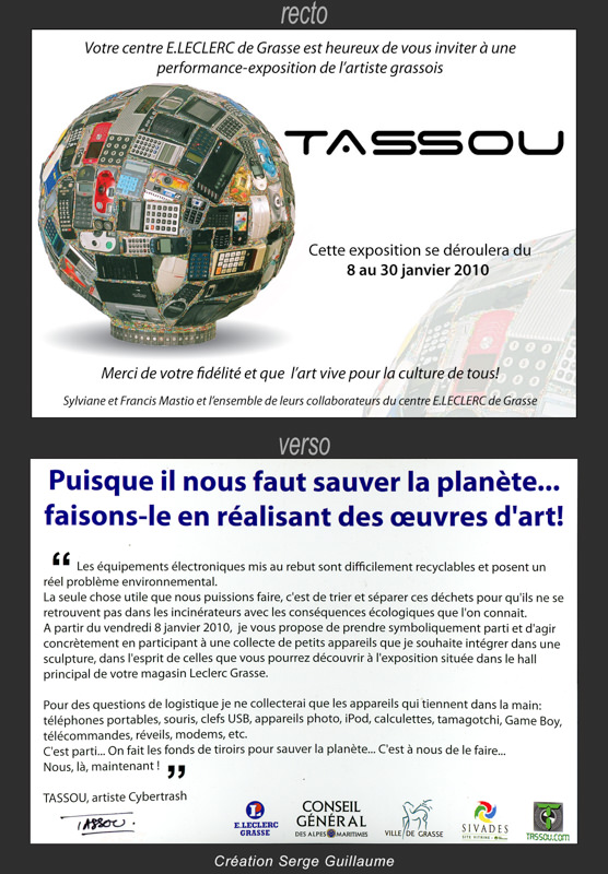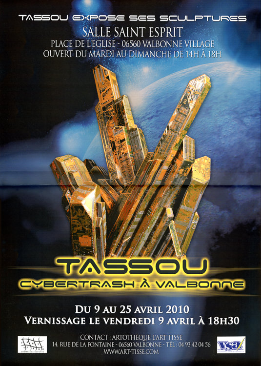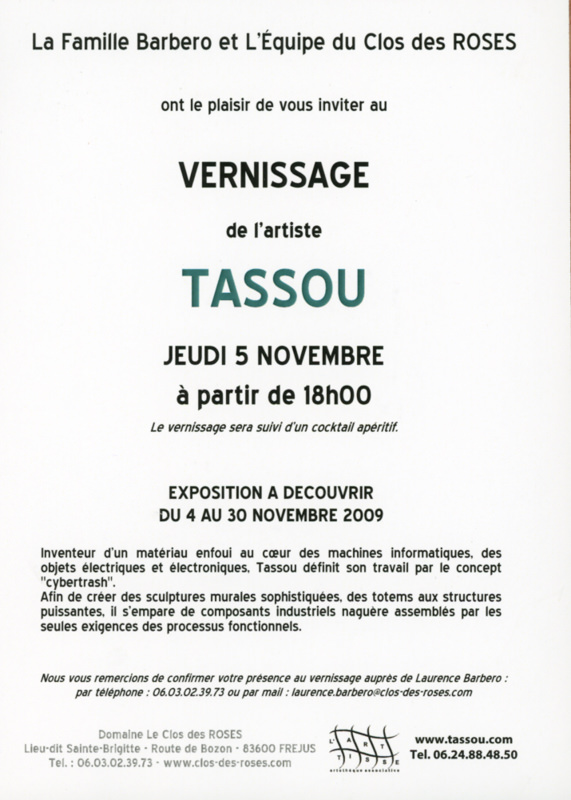 Du 9 au 11 juillet 2010, Tassou y a exposé 6 pièces et a présenté sa cuvée « Tassou.com » en série limitée avec bouteilles numérotées et signées, habillées d’une étiquette créée spécialement par sa fille Mélody. Le vin sélectionné est celui de son ami Henri Colin qui, sur sa colline de Moutherot dans le Doubs, produit un Chardonnay naturel selon les méthodes ancestrales respectueuses de l’environnement. Chaque bouteille est taguée avec un QR Code fourni par Serge Miranda de l’Université de Sophia Antipolis.